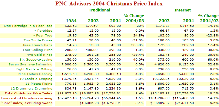As part of its annual tradition, PNC Advisors also tabulates the “true cost of Christmas,” which is the total cost of all of the items in the famous carol, including the repetitions. The price tag for the 364 items this holiday season is $66,334 up from $65,264 in 2003. The 1.6 percent increase pales in comparison to last year’s 19 percent increase, which may be due to lower consumer confidence this season according to Kleintop.