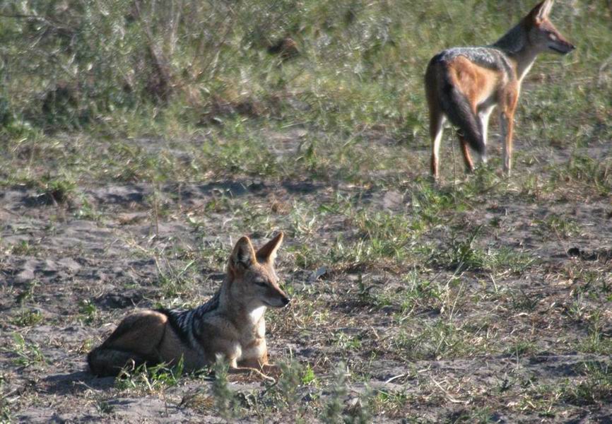 Diana and Roger had warned us that the drive to camp would take about 45 minutes – it actually took longer because we kept stopping for animals: ostriches, some tawny eagles and a battaleur snacking on something on the ground, a big herd of zebra and wildebeest, three jackals running off with the remains of something, a herd of zebra and impala and a bull hippo sitting grumpily in the middle of the river.