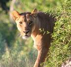 One lioness was sitting apart from the other one who had all the cubs. Mots said there were three boys and two girls from two litters, and they were all within two weeks or so in age, about two to three months old. It is common for the lionesses to take turns watching and feeding all the cubs. Since there are five of them and only four nipples, there was much growling and complaining among the cubs as they scrambled up and over mom. We took quite a few pictures, but hope to find them again tomorrow in daylight.