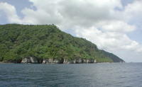 Around 6:00 a.m. we moved anchorage from Chatham Bay to Yglesias Bay on the south side of the island. It was nice to see more of the island. Nico said that it is the end of the dry season, and they haven't had rain for 20 days or so. While we saw some waterfalls, normally the island looks as though it is "crying." Our new anchorage is right near a large waterfall that the crew said was used in one of the Jurassic Park movies - the third one, I believe.