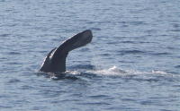 This time we got a nice viewing. A BIG Sperm whale, right on the surface. He swam near us for several minutes, blowing out through his blow hole. When we were less than 100 feet away, he decided he'd finally had enough, took a deep breath and submerged, giving us a nice tail fluke showing at the end. Magnificent!