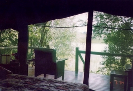 The women were there singing again. They carried our bags to the tents we were assigned. We were again in #1. I suppose they put the old folks close to the main building. Our tent is right on the water and has a porch or veranda along two sides. There is a tree, called the Sausage Tree that shades the tent. It is called a Sausage Tree because there is fruit that hangs down that really does look like sausages. It is poisonous to humans but the baboons and antelope like to eat the blossoms. Inside, the room is very nice with a curtain separating the bath area from the bedroom. There is also a shower curtain. Again, Steve gave Jim his own tent.