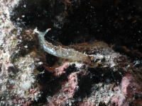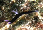 The Febrina's on-board water-maker wasn't working, so while both boats dove the site, the crews worked on our equipment. We waited until their divers were done - I called Carol at the office (nothing going on) and Richard (front windows are in, master bathroom is greenrocked) - and then dove "Jane's Gully." It is a seamount with the top of the reef at 20 feet with sharp drops on all sides. Schooling barracuda, a huge white pluribranch (the name for large nudibranchs), and dozens of what I refer to as "Mint Chocolate Chip" nudibranchs - they are pale mint green with black spots or black with mint green spots. Saw a free swimming moray being chased off by several species of smaller fish. Gary found a tiny, beautiful nudibranch on the top of the reef at the end.