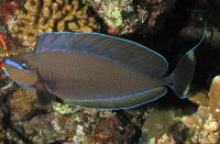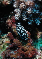 This time I found Gary on the way back up - his camera batteries were dead. I decided not to cross to The Arches but stayed on the main bommie. Several divers were surrounding a sea fan containing a pygmy seahorse. Unfortunately, the crowd was too deep for me to get a look at it - it's tiny. The top of the reef was very nice. Josie found a flatworm swimming, and a nice blennie in his hole. Nelson pointed out an octopus hiding in a hole. He came out a little bit and promptly changed colors, pretending he wasn't really there.