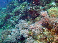 We didn't have far to go to our first dive site in the morning. We dove the left side of a nearby channel and had a great dive. There was a nice reef top at about 20-25 feet and then a great wall dive over the edge. Andy, the divemaster, took the photographers to see if they could find pygmy seahorses - I figured I wouldn't get a chance to see much of anything anyway, what with all the "testosterone fish" trying to get pictures of it, so I cruised the reef instead. It was really lovely - saw some great anemones and a spectacular nudibranch. Luckily, Gary was swimming nearby so he got a nice picture of it and dubbed it the "Kaydibranch."